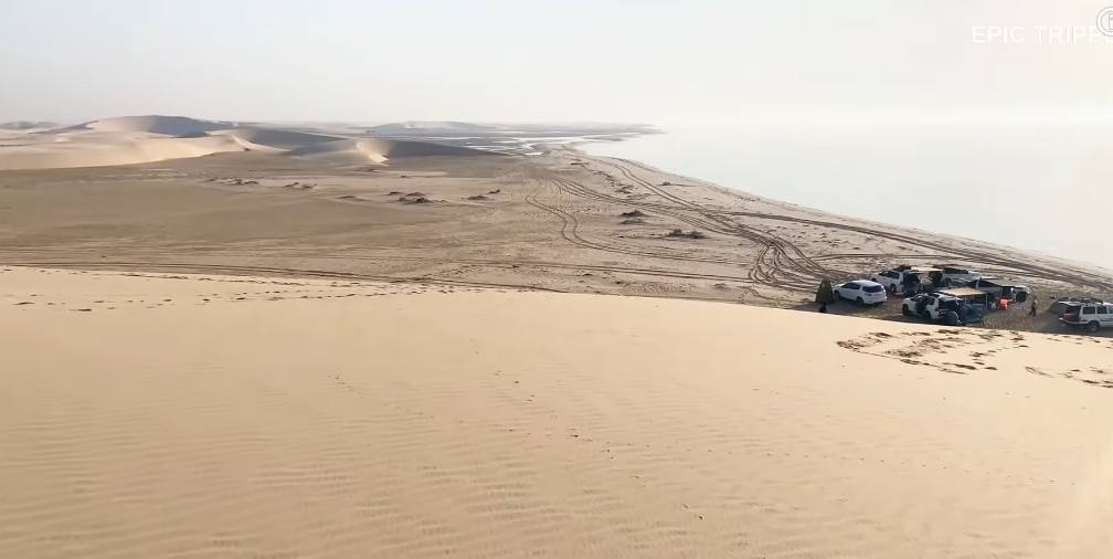 Δίπλα στα γαλαζοπράσινα νερά της «Εσωτερικής Θάλασσας», μια αλμυρή είσοδο από τον Κόλπο, βρίσκονται οι εντυπωσιακοί αμμόλοφοι που κινούνται συνεχώς.